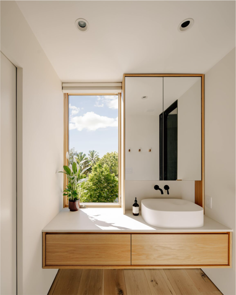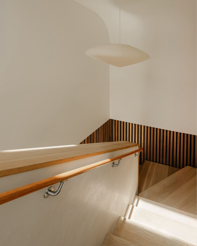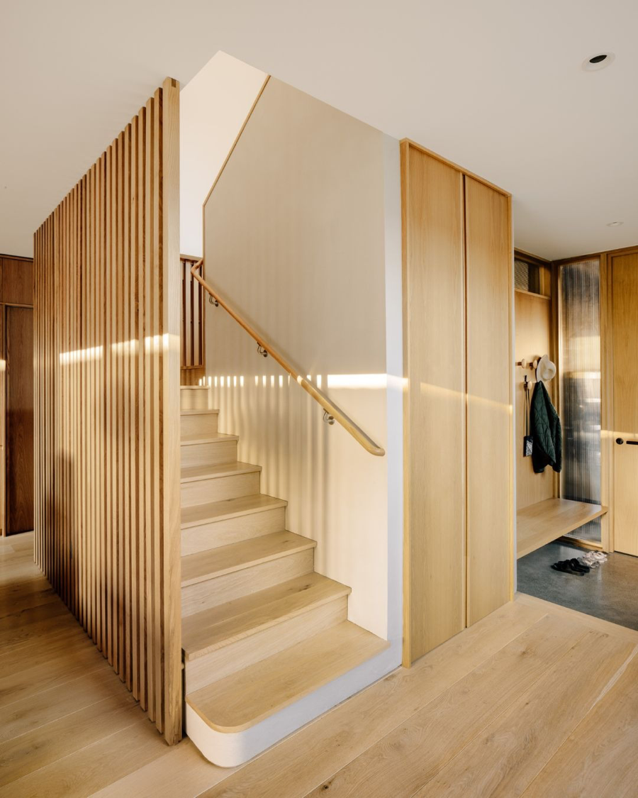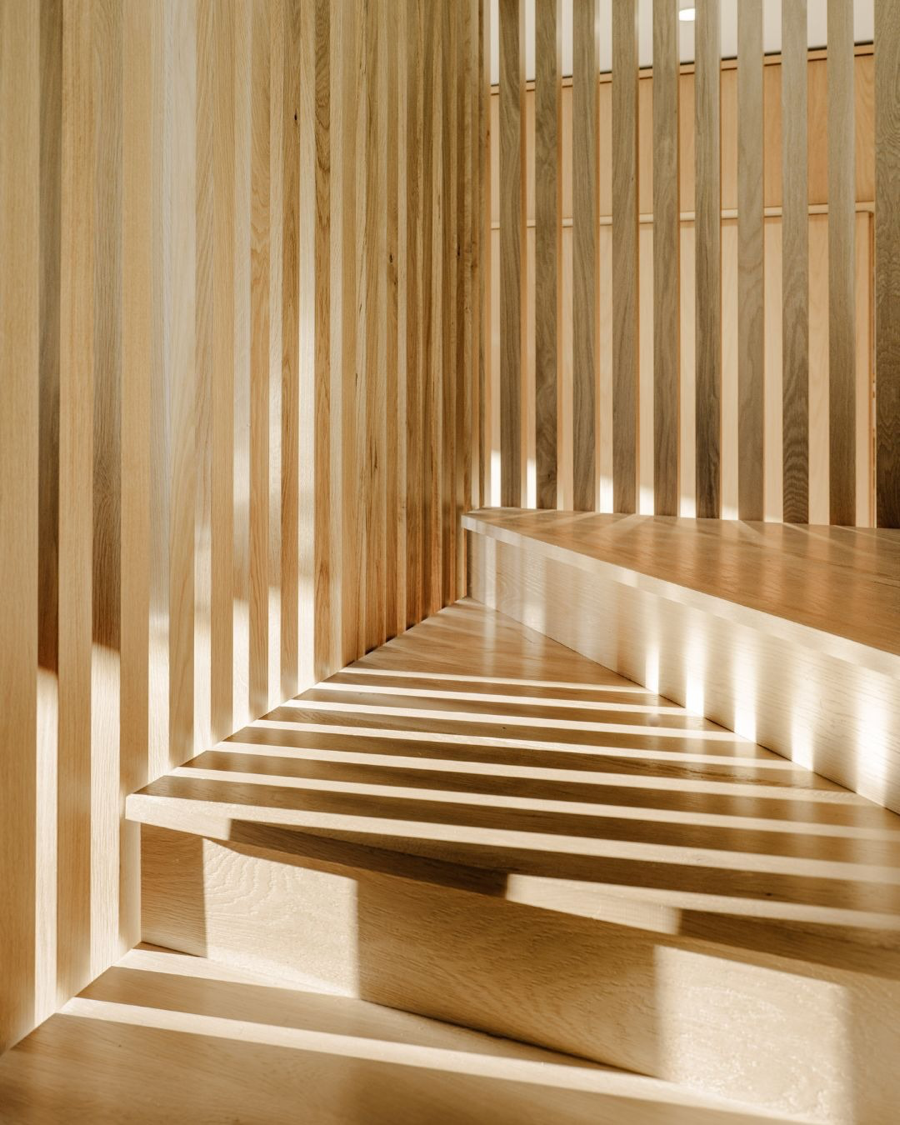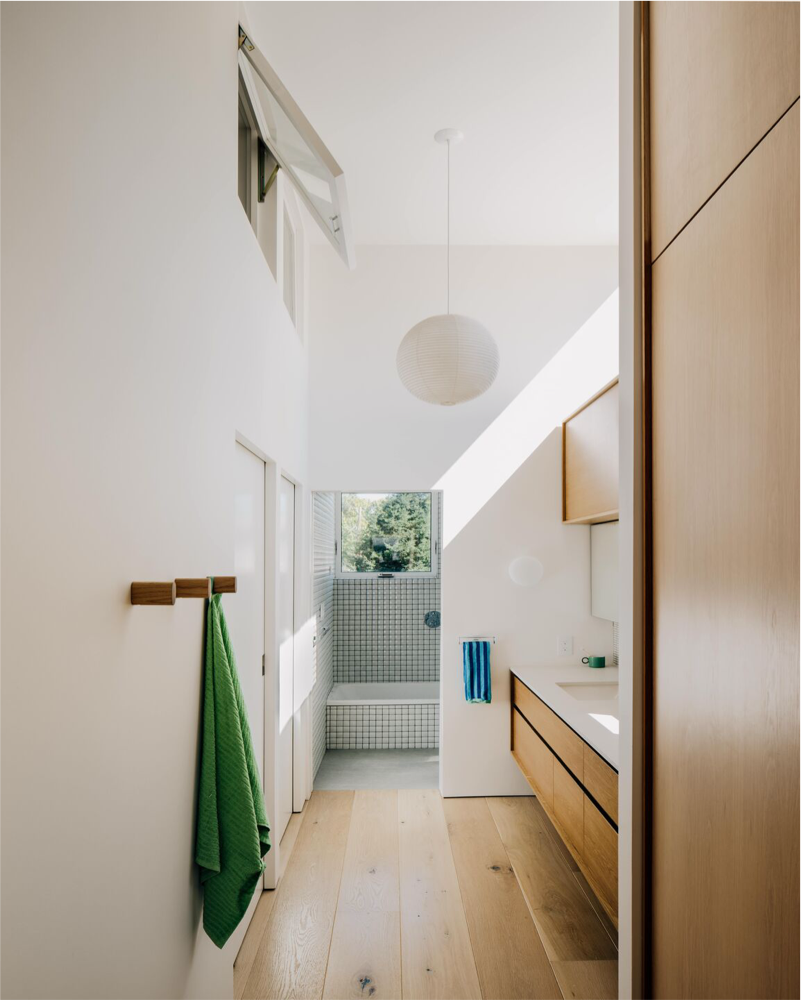 This contemporary net-positive energy home features Character Grade White Oak Flooring in 10″ widths, along with custom Stair Treads and detailing. The central skylit stairwell serves as both a sculptural focal point and a vertical thermal flue. Flooring and stairs are finished with Mad River Valley, an elegant, muted finish with cool white undertones and a very low sheen.