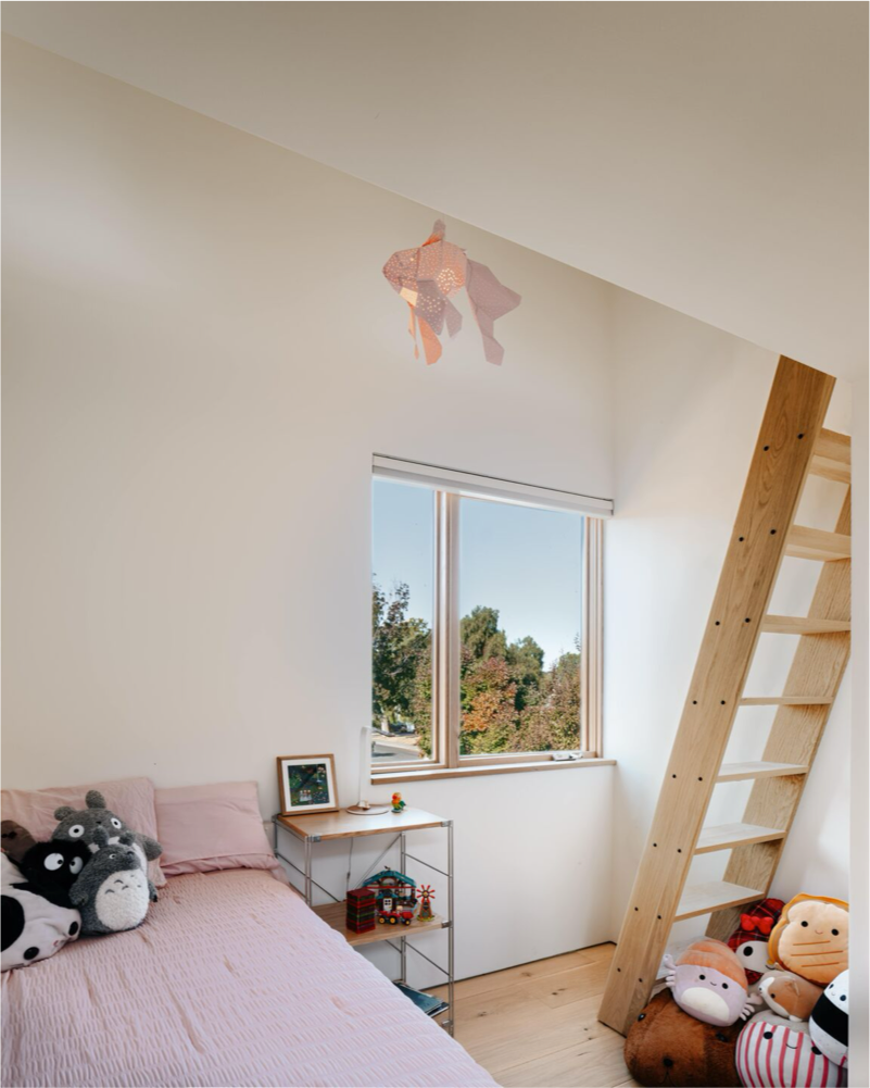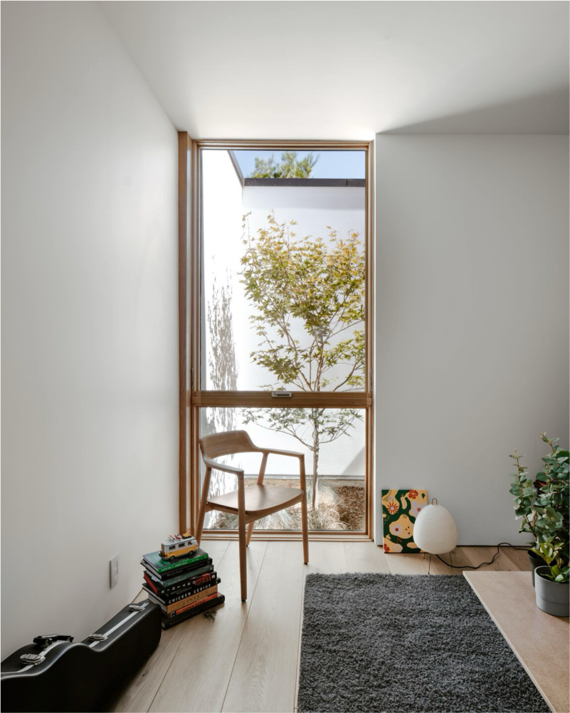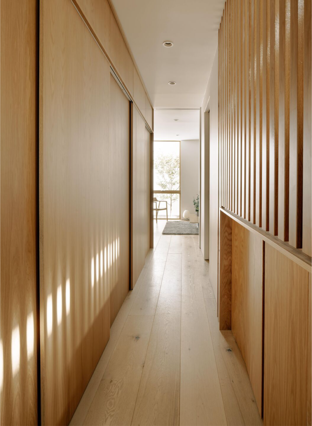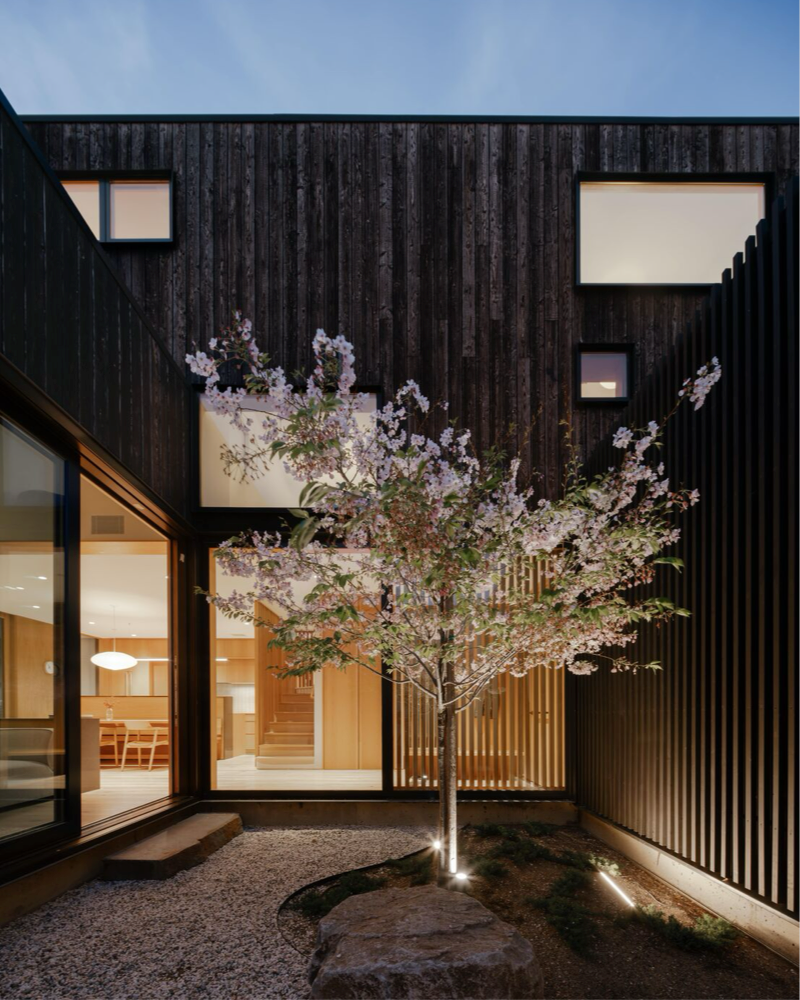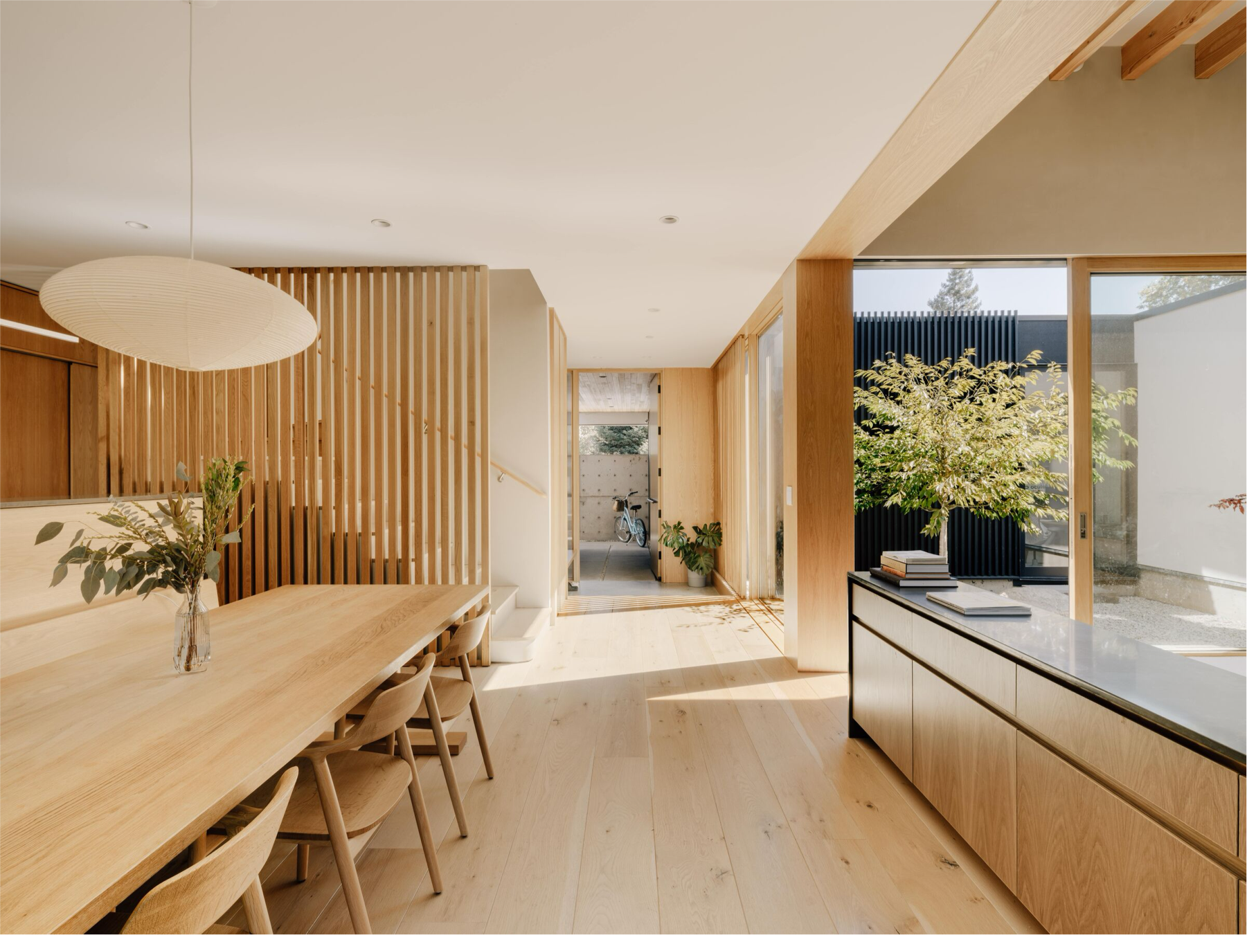 This contemporary net-positive energy home features Character Grade White Oak Flooring in 10″ widths, along with custom Stair Treads and detailing. The central skylit stairwell serves as both a sculptural focal point and a vertical thermal flue. Flooring and stairs are finished with Mad River Valley, an elegant, muted finish with cool white undertones and a very low sheen.