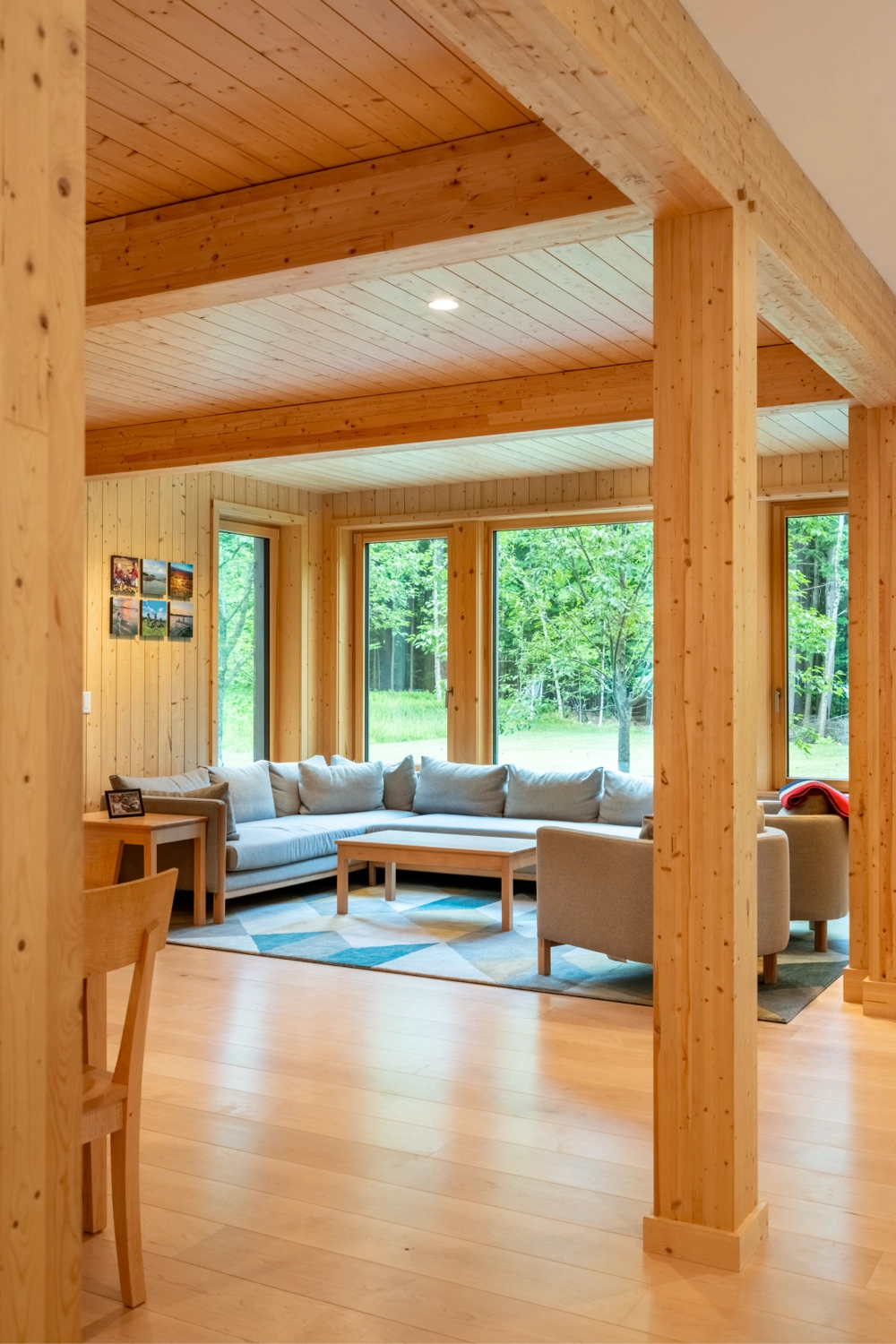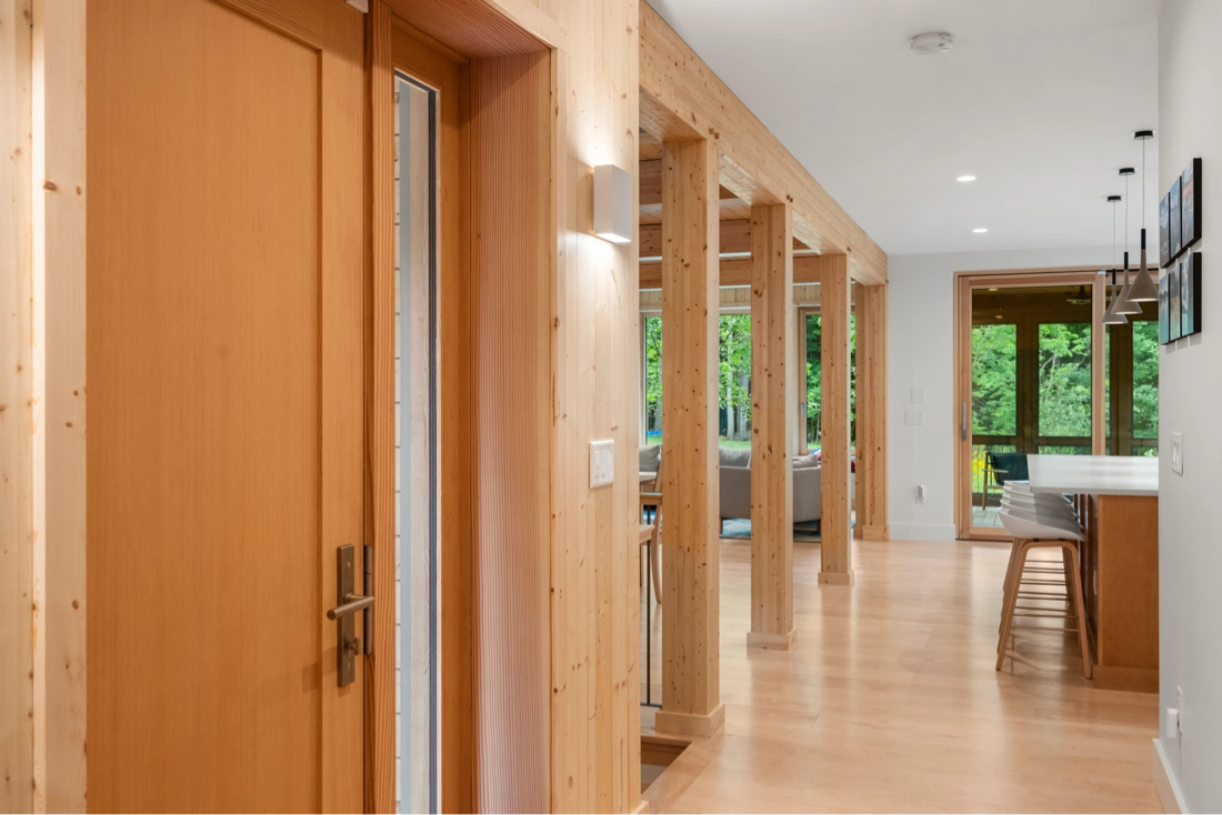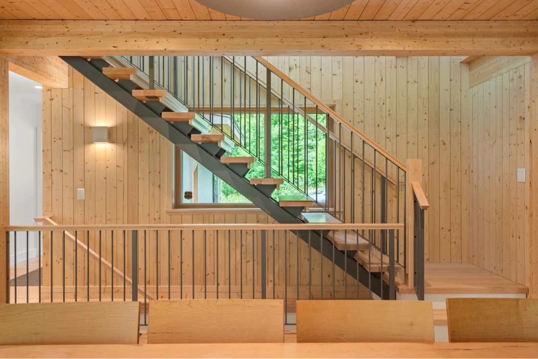 This open-concept Scandinavian-inspired home, from the master timber framers @ Bensonwood, features Select Hard White Maple in 8″ widths and custom Maple stair treads. Flooring and stairs are finished with Killington Peak, a rich finish that accentuates the Maple’s golden-brown tones.